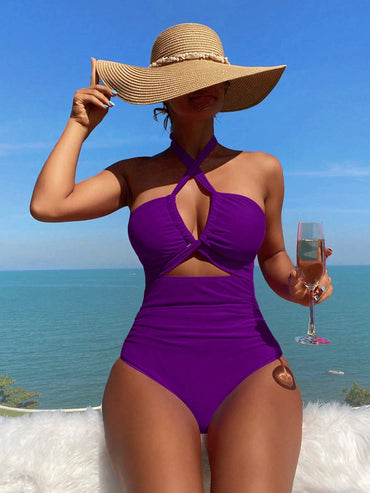 Details: Backless, Criss Cross, Ruched Length: Short Neckline: Halter Sleeve Length: Sleeveless Color: Purple Style: Casual Pattern Type:...