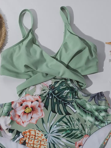 Bikini Small Floral Print Deep V Plunge Sexy Bikini Split Swimsuit Women
