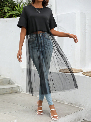 Details: Sheer, Contrast Mesh Sleeve Type: Drop Shoulder Style: Casual Hem Shaped: Asymmetrical Color: Black Pattern Type: Plain...