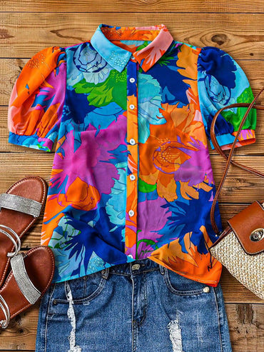 Color: Multicolor Hem Shaped: Regular Style: Boho Sleeve Type: Puff Sleeve Details: Button Neckline: Collar Type: Shirt Pattern...
