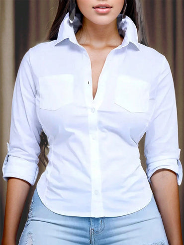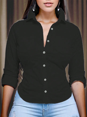 VaVaLuxe Women Spring/Summer Solid Color Roll Sleeve Casual Office Blouse Shirt,Long Sleeve Tops