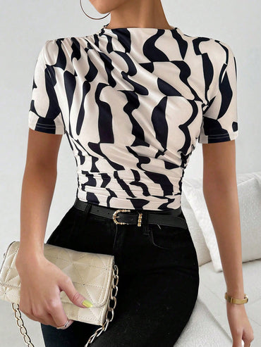 VaVaLuxe Women Asymmetrical Geometric Print Pleated Turtleneck T-Shirt Graphic Tees Women Tops