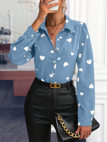 Color: Black Style: Casual Sleeve Type: Regular Sleeve Details: Button Neckline: Collar Type: Shirt Pattern Type: Heart, All...