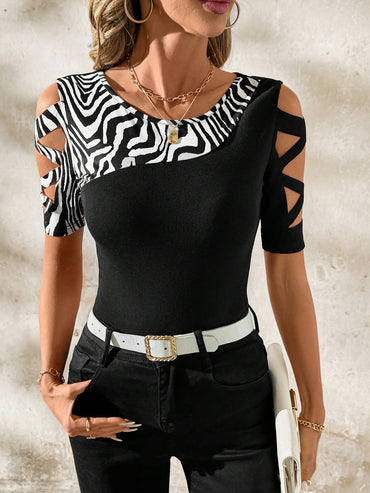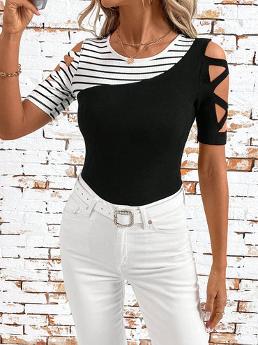 Details: Criss Cross, Cut Out Sleeve Type: Regular Sleeve Style: Casual Color: Black and White Pattern Type: Colorblock...