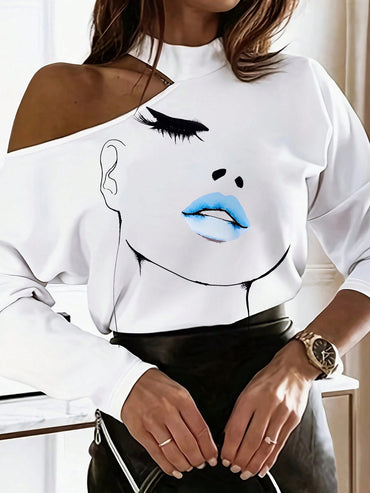Details: Asymmetrical, Cut Out Sleeve Type: Batwing Sleeve Style: Casual Color: White Pattern Type: Cartoon, Figure Neckline: Stand...