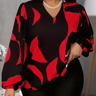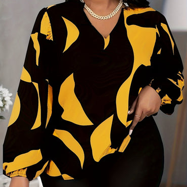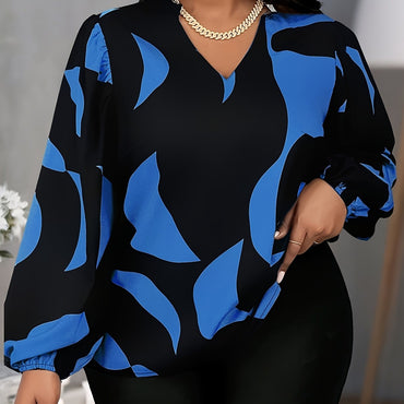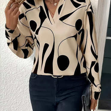 Elegant Women's Geometric Print V-Neck Blouse - Casual Long Sleeve, Polyester, Non-Sheer - Perfect for Spring & Fall Fashion