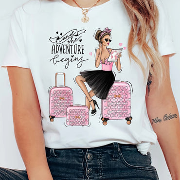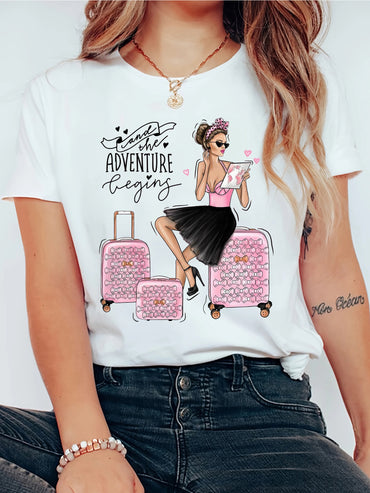Women'S Travel-Themed Casual Crew Neck T-Shirt, 95% Polyester 5% Spandex Knit Fabric, Soft Elastic Short Sleeve Top with Stylish Luggage Girl Graphic, All-Season Fashion