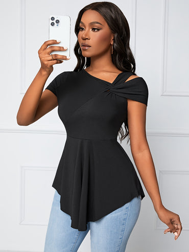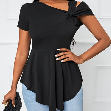 Women'S Summer Knit Top, Asymmetrical Neck Solid Color Polyester Tee, 95% Polyester 5% Elastane, Lightweight 180g/m², Regular Length Fashion Pullover Shirt