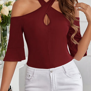 Women's Elegant Off-Shoulder Bell Sleeve T-Shirt - Solid Color Black, Polyester, Keyhole Front, Ruffle Detail, Machine Washable