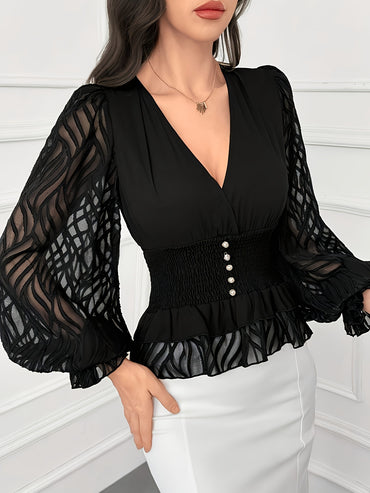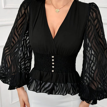 [1pc Elegant V-Neck Blouse] 1pc Elegant V-Neck Long Sleeve Blouse for Women - 100% Polyester Solid Color Top with Sheer Sleeves, Casual Woven Shirt for All Seasons