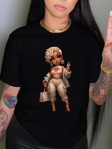 Stylish Women's Graphic Tee - Casual Crew Neck, Short Sleeve, Polyester Blend, Machine Washable - Versatile All-Season Black Top with Trendy Cartoon Print