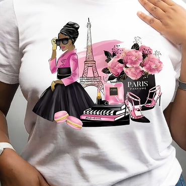 Parisian Girl Print Casual T-Shirt, Women's Short Sleeve Crew Neck Top for Spring & Summer