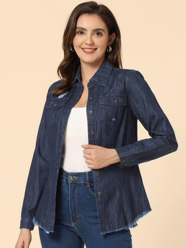 Women'S Jean Shirts Spring Casual Long Sleeve Button Frayed Distressed Denim Shirt
