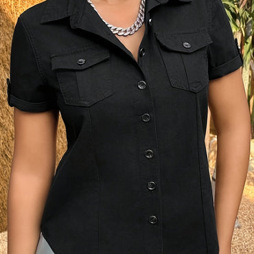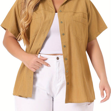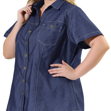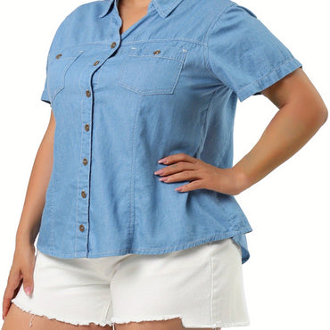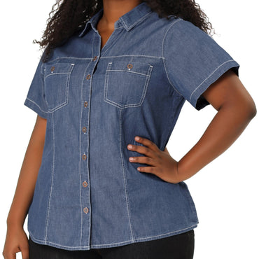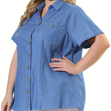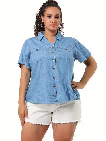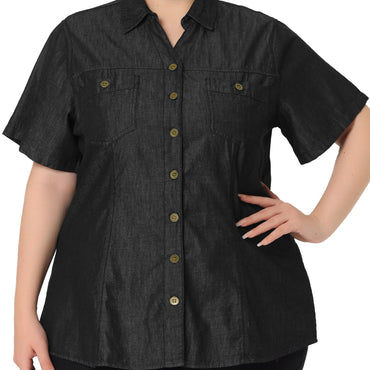 Women's Plus Size Short Sleeve Denim Shirt - Classic Button- Chambray, Black, Casual Collared Blouse with Chest Pockets, Machine Washable, Spring/Summer/Fall Essential, Short Sleeve Blouse