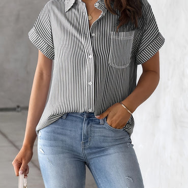 Women's Elegant Striped Drop Shoulder Short Sleeve Button-Up Shirt - Purple & White Vertical Stripes, Polyester, Machine Washable, Spring/Summer Casual Wear, Spring Fashion Top | Striped Blouse | Glossy Texture