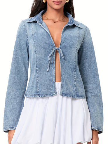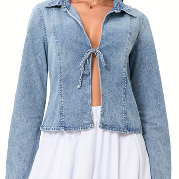 Chic Tie-Front Denim Shirt for Women - Casual Long Sleeve, Solid Color, V-Neck Top - Perfect for Fall/Winter Streetwear & Clubbing