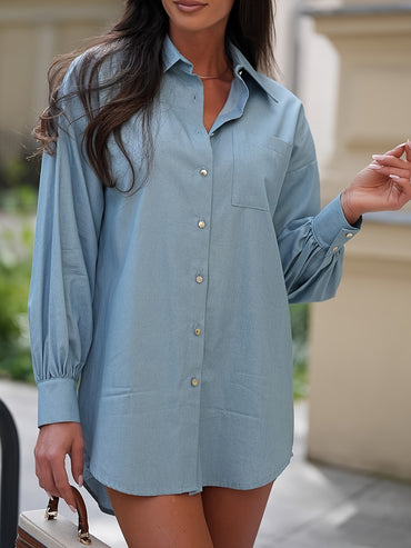 Minimalist Chic| Women's Light Blue Casual Denim Shirt - Single-Breasted, Long Sleeve, Loose Fit with Ruffled Cuffs and Hem, Polyester Blend, Ideal for Spring/Fall