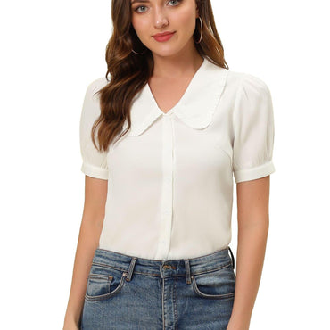 Chambray Shirt for Women'S Doll Collar Puff Sleeve Vintage Denim Blouse