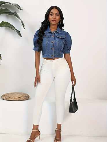 Women's British Style Light Blue Denim Jacket - Casual Short Sleeve, Button-Up Crop Top with Flap Pockets, Machine Washable