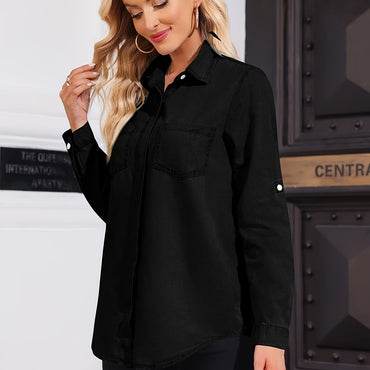 Women's Black Denim Shirt - Casual Collared Long Sleeve Blouse with Chest Pockets, Button- Front, Comfortable & Stylish for Casual Attire, Versatile Wardrobe Item | Fashionable Blouse | Stylish Stitching, Denim Top
