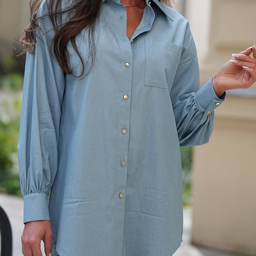 [Durable Build] Elegant Women's Long Sleeve Denim-Inspired Blouse - Chic French Vintage Style, Versatile & Comfortable with Ruffled Button Detail, Perfect for Office or Commute