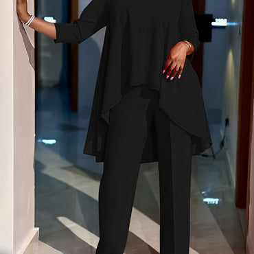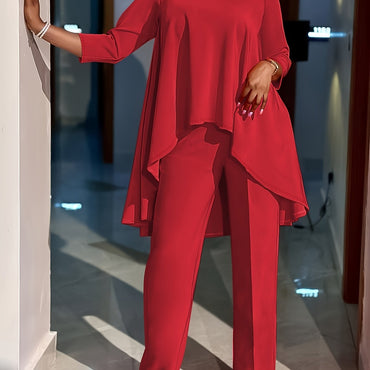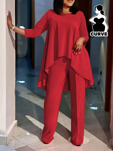 Casual Chic Plus Size Elegant Red Two-Piece Set for Women - Chic Short Sleeve Round Neck T-Shirt with Asymmetrical Hem & Stretchy Full-Length Pants, 92% Polyester & 8% Spandex, Machine Washable - Perfect for Spring & Autumn