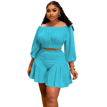 plus Size Women Clothing Pleated off Neck Fluffy Waist Trimming Casual Two Piece Sets