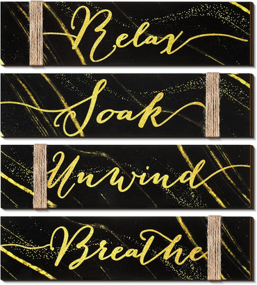 • 4 Pieces Relax Soak Unwind Breathe Wall Art Wooden Hanging Signs Rustic Vintage Farmhouse Gold Bathroom Wall Decor for Home Laundry Spa Room (Modern Style, 10 x 4 Inch)