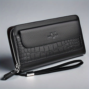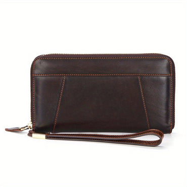 Men's Vintage Genuine Leather Zipper Wallet - Long Style, Brown with Stitching & Wrist Strap, Top Layer Cowhide, Casual Design, Everyday Carry Wallet | Wrist Strap Wallet | Durable Leather Wallet
