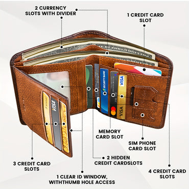Mens Wallet Genuine Leather Trifold Wallet RFID Blocking Anti-Theft For Biker, Motorcycle