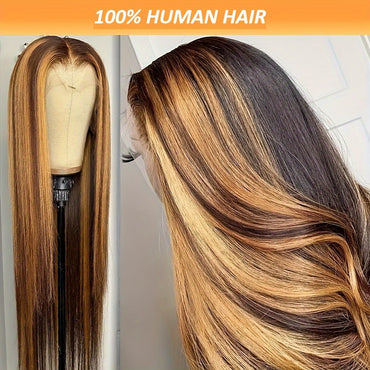 Honey Blonde Ombre 4/27 Straight Hair Lace Front Wig - 13x4 HD Straight Lace Front, 150% Density, Pre-Plucked, Human Hair, 22-30 Inches Long, Natural Looking, Soft and Silky, Easy to Style and Maintain