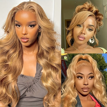 13x6 Honey Blonde Wig Human Hair 180% Density Peruvian Transparent Lace Frontal Wigs Human Hair Pre Plucked With Baby Hair 20-34 Inch Body Wave Wig 27# Colored