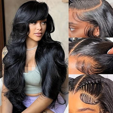 200% Density 100% Brazilian Virgin Human Hair Body Wavy Wigs With Bangs Long And True Length Human Hair #1B Glueless Body Wavy Full Machine Made Scalp Top Wig No Lace Front Wigs For Women Natural Color