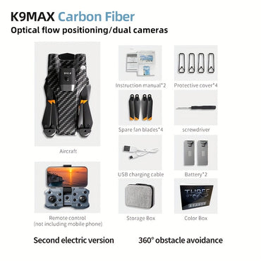 • Avec deux batteries K9MAX Drone avec ESC Trois caméras, maintien de l'altitude Évitement d'obstacles infrarouge à 360°, atterrissage à une touche Suivi de trajectoire Télécommande pliable double Drone