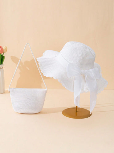 • 2pcs Women's Khaki Wavy Bow Beach Sun Hat And Straw Handbag 2-Piece Set, Suitable For Travel Valentine's Day Valentines