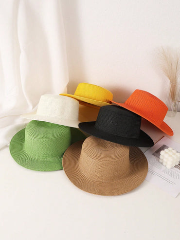 1pc Women's Solid Color Flat Top Small Brim Sun Hat, Simple & Versatile Straw Hat Suitable For Beach Vacation Photoshoots