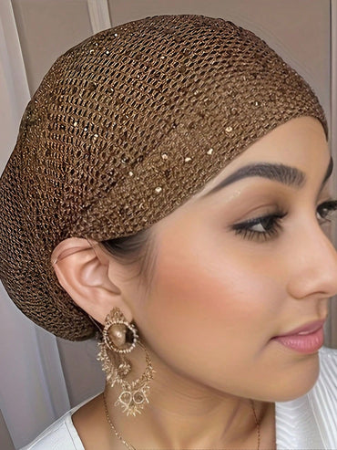 1pc,Elegant Solid Color Knitted Polyester Women's Hair Cap With Drawstring - Stretchable, Soft, Breathable, Lightweight Hat, Adorned With Rhinestones, Urban Easter Theme, Feather Free, Anti-Static, Women's Elastic Hair Cap