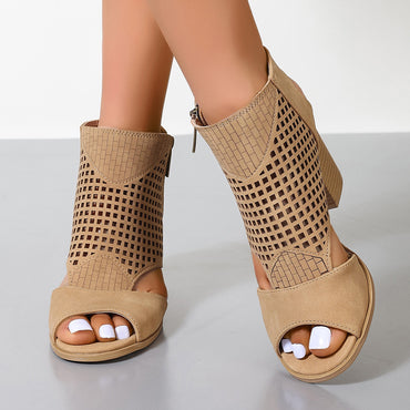 Camel Faux Leather Hollowed Women High Heeled Sandal Side Zipper Chunky Heel Height Increasing Women Sandals