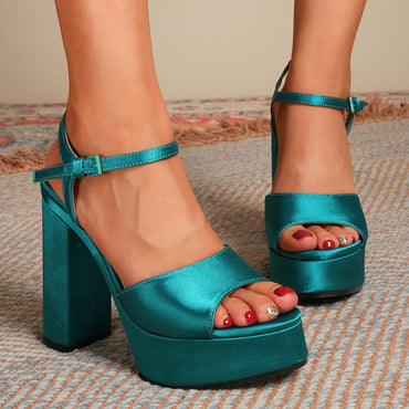 Peep Toe Sandals Women plus Size Satin Fabric Chunky Heel Ankle Ring Buckle Sandals