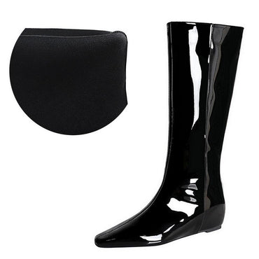 Wide Tube Women Boots Back Zipper Square Toe Middle Heel Wedge Height Increasing ole Shiny Patent Leather High Leg Boot