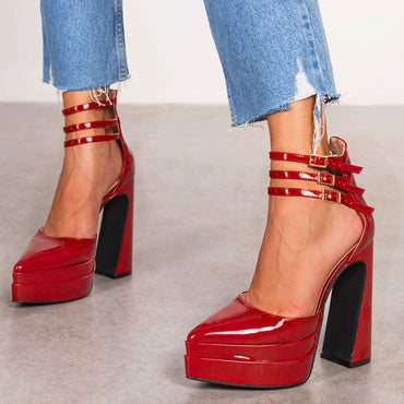 Simple Thick Heel Super High Heel Waterproof Platform Patent Leather Square Toe Ankle Strap Shoes High Heels