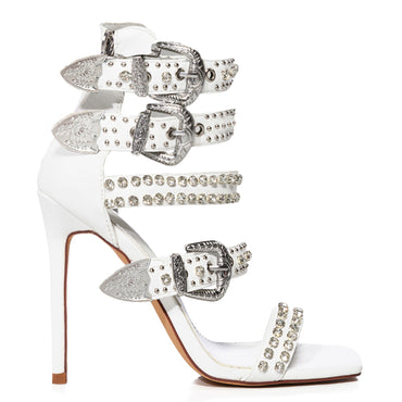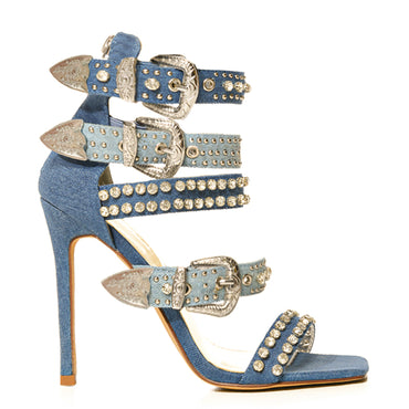 High Heels Sandals Women Heels Rhinestone Rivet Black White Denim Three Colors plus Size 11cm Stiletto Square Toe