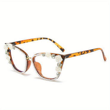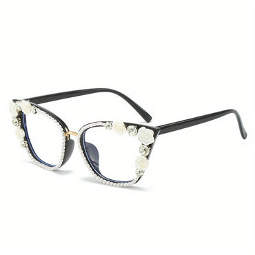 Women's Anti-Blue Light Glasses - Non-Prescription Computer, Phone, Party Eyewear with Cat Eye Effect & Floral design - Anti-Eye Strain, Black Frame with White Floral Accents - Compatible with Smartphone, Tablet, Laptop - Elegant Glasses for Women, Everyd