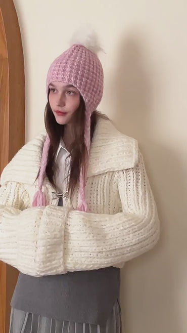Japanese Solid Color Warm Keeping Earmuffs Hat Women Autumn Winter Fashionable Face Looking Small Knitted Beanie Hat All Matching Sleeve Cap Trendy