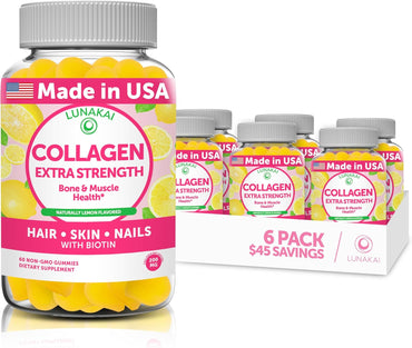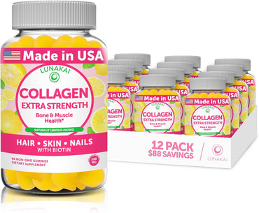 Lunakai USA Made Collagen Peptides Gummies - 200mg Non-GMO Anti-Aging Formula with Biotin, Zinc, Vitamins C & E for Hair, Skin and Nails, 60ct