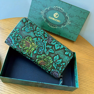 [Vintage Style Long Clutch Wallet] Elegant Dark Green Vintage Style Long Clutch Wallet - Faux Leather, Multiple Card Slots, Zipper Closure, Polyester Lined, Slip Pocket, Credit Card Compartment