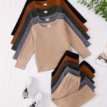 10-Piece Toddler Boys Outfit Set, Casual Solid Color Soft Knitted Fabric, Long Sleeve Top and Pants, Regular Fit, Stretchy Polyester and Spandex, Round Neck, for Autumn/Winter Season, For Outdoor