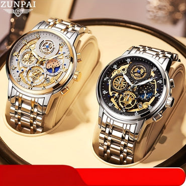 100%Original ZUNPAI Men's Watch Waterproof Stainless Steel Silvery/Golden High Quality Business Fashion Watch For Men Analog Multifunction Chronograph Sun/Moon/Sta Calendar Luminous Wristwatch Luxury Brand Authentic [Free With Box]
