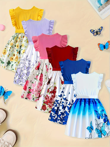 6pcs Set Girls' Elegant Butterfly Pattern, Floral Print Dress with Ruffle Sleeves + Belt, Girls' Romantic Style, Pastoral Style, Vacation Casual Dresses Perfect for Girls, Holiday Party, Gathering/Birthday/Outdoor/Summer Outing/Everyday Wear