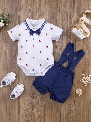 2pcs Baby Boys Casual Short Sleeve Polo Shirt & Suspender Pants Set, Polyester Ditsy Floral Pattern, Loose Fit, Non-Stretch, Spring/Summer/Fall, for Outdoor